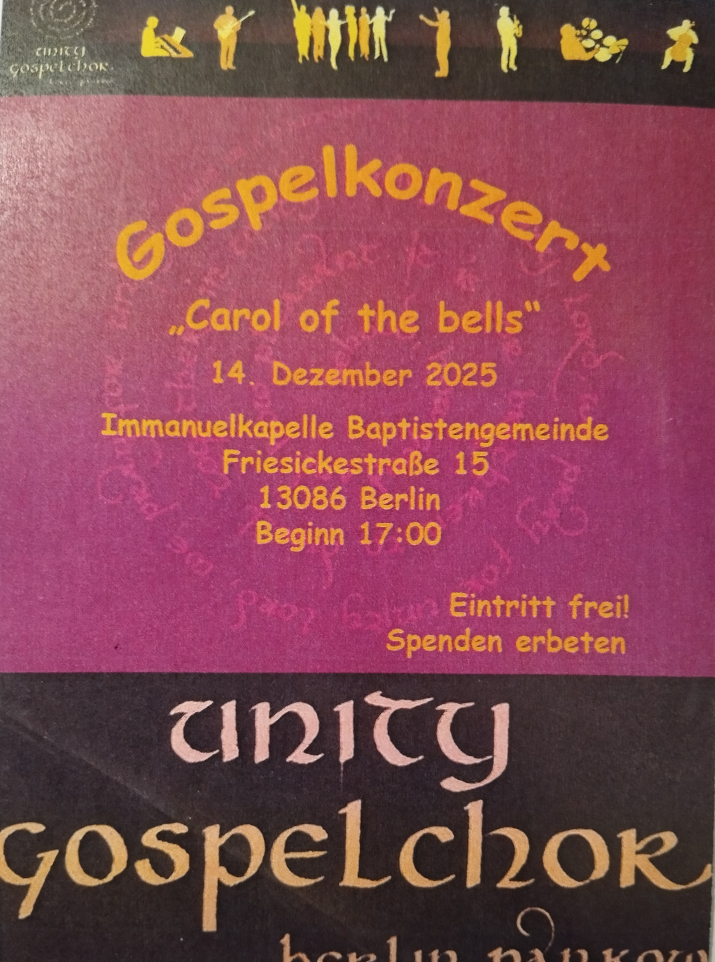 Dann laden wir herzlich zum Gospelkonzert am Sonntag, 14.12. um 17.00 Uhr in unsere Immanuelkapelle ein. Der Unity Gospelchor Pankow will mit seinem Programm "Carol oft he bells"- Das Läuten der Weihnachtsglocken - uns auf die Vorweihnachtszeit einstimmen. Der Eintritt ist frei- Spenden sind erwünscht. Anschließend gibt es Glühwein und Punsch in der festlich geschmückten Kirche.