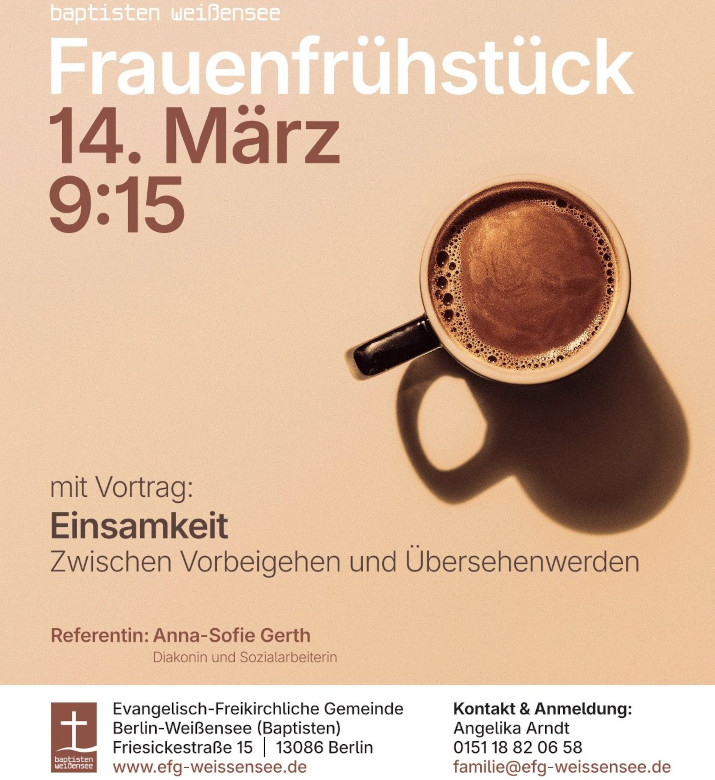 Wir laden wieder herzlich alle Frauen mit Freundinnen, Nachbarinnen,... zum Frauenfrühstück ein. Das Thema heißt: „Einsamkeit", das zur Zeit viel diskutiert wird, weil es laut Umfragen so aktuell ist und das in allen Altersgruppen. Anna-Sofie Gerth ist Diakonin und Sozialarbeiterin und arbeitet in verschiedenen Frauenprojekten. Sie wird mit uns nach einem ausgiebigen Frühstück über dieses Thema nachdenken und Impulse geben. Und wir wollen gemeinsam Hoffnungszeichen in dieser sehr komplexen Zeit erarbeiten, uns miteinander austauschen und gestärkt in den Alltag gehen. Ihr könnt die Mail gern weiter leiten.