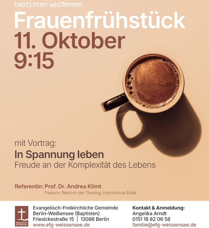Wir laden alle Frauen herzlich zum Frauenfrühstück ein. Das Thema heißt In Spannung leben - Freude an der Komplexität des Lebens. Prof. Dr. Andrea Klimt, Pastorin und Rektorin der Theologischen Hochschule Elstal wird mit uns nach einem ausgiebigen Frühstück über dieses Thema nachdenken und wir wollen Hoffnungszeichen erarbeiten, uns miteinander austauschen und gestärkt in den Alltag gehen.